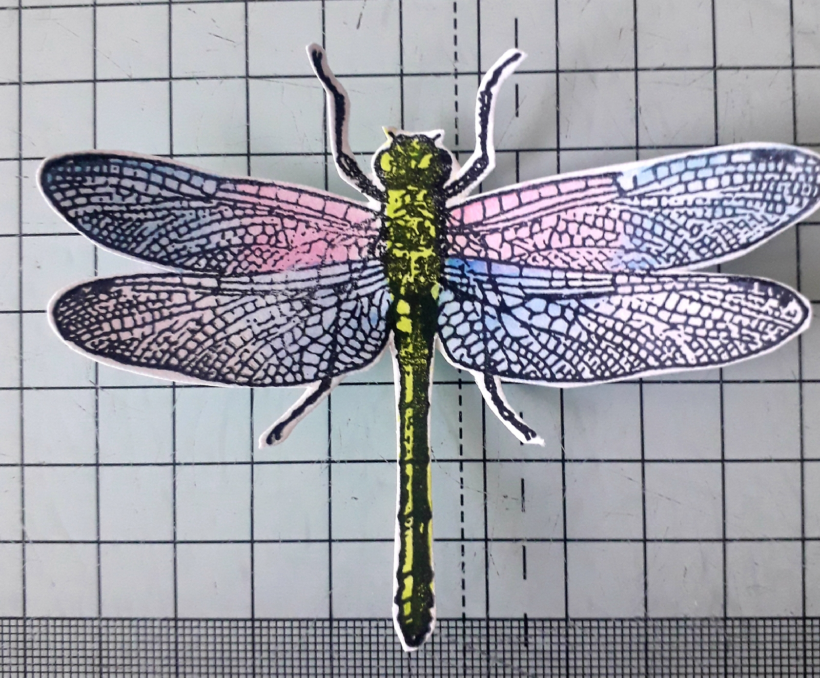 On seperate card I stamped the large flower and two small flowers from the blooming blooms stamp set using nocturne ink and the top part of the leaf stamp from Journaling Essentials 7 using evergreen bough distress oxide ink. I coloured the flowers with watercolour pens and then cut them and the top leaf out.