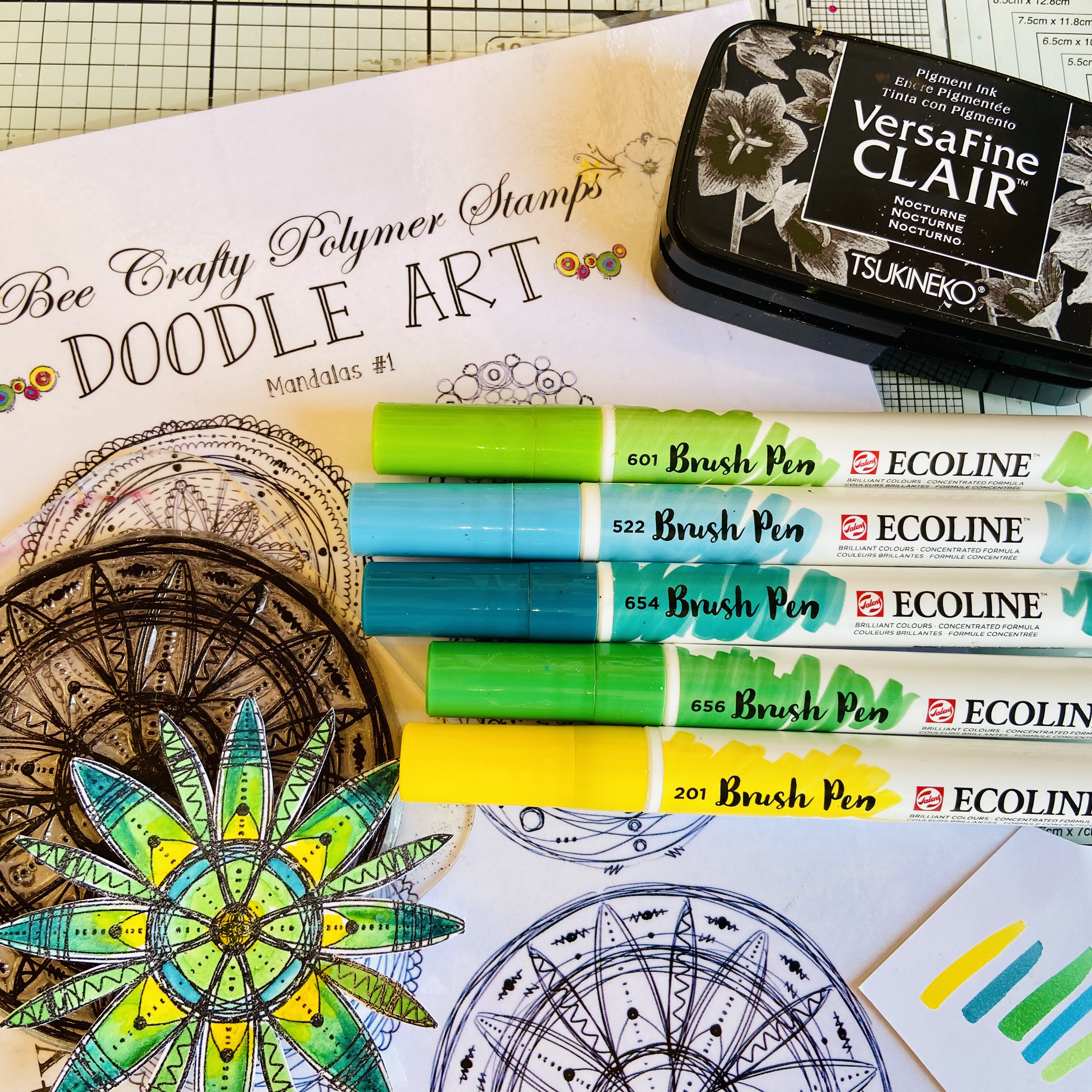 This card too was simply stamped with distress oxide inks before colouring and layering up one of the larger mandalas as a centrepiece.