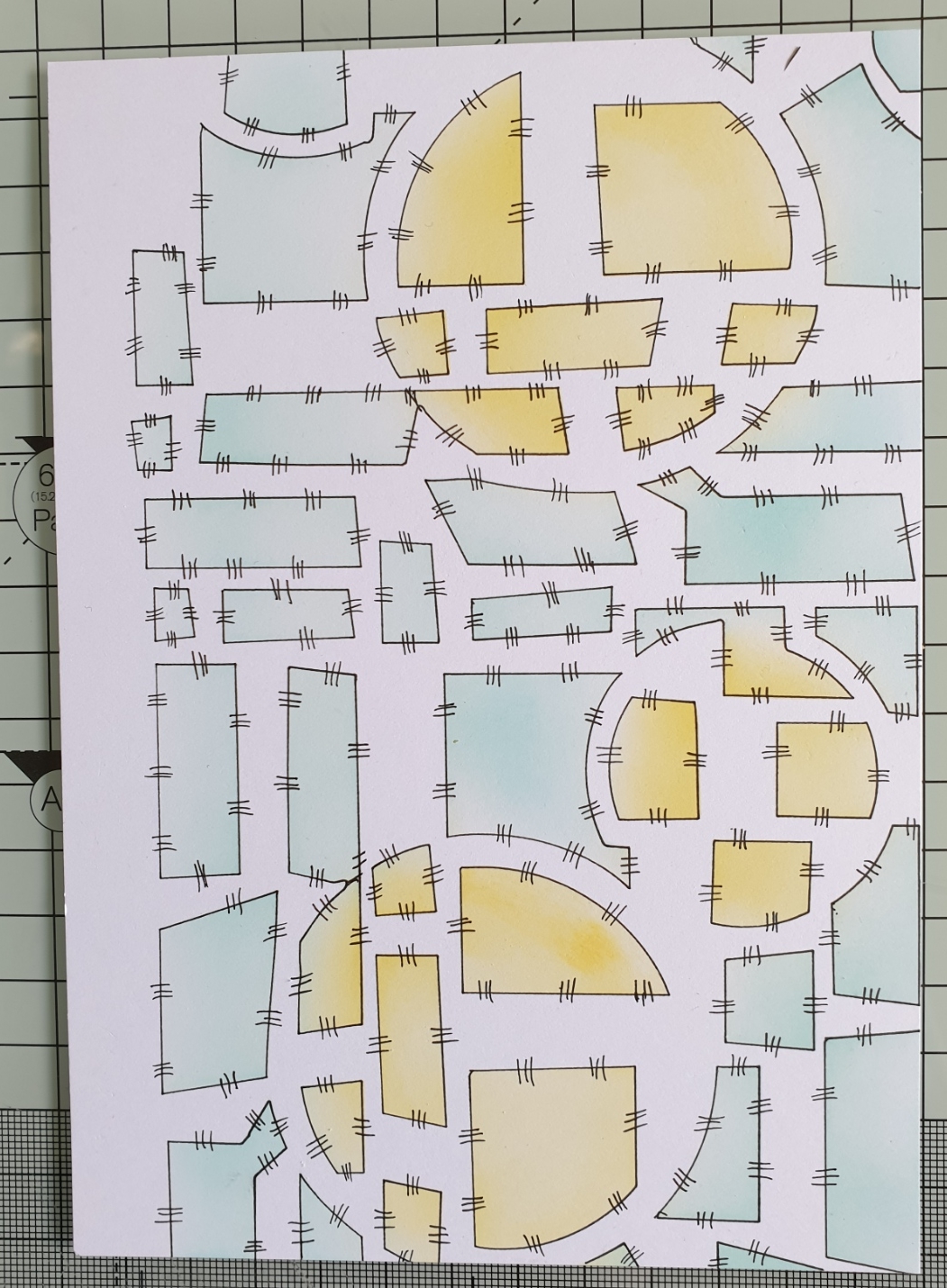 Next, I stamped the sentiment onto a scrap of card and then used Squeezed Lemonade to stamp the small circles from the Art Journal Elements 3 around the edges. Once this was thoroughly dry, I coloured the circles with Peacock feathers which I watered down quite heavily.