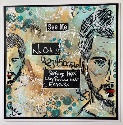 Using oxide inks I added some of the smaller stamps from the "See me" and stamps from Journal art elements set #3. I used a slightly darker shade for the blue to help make them stand out.