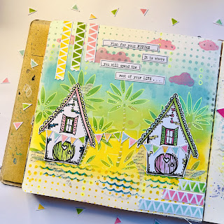 Add a few waves with the texture disc & Salty Ocean ink… Glue houses to page, add some triangles as if it were bunting… I added a little washi tape around the houses ( later pics)