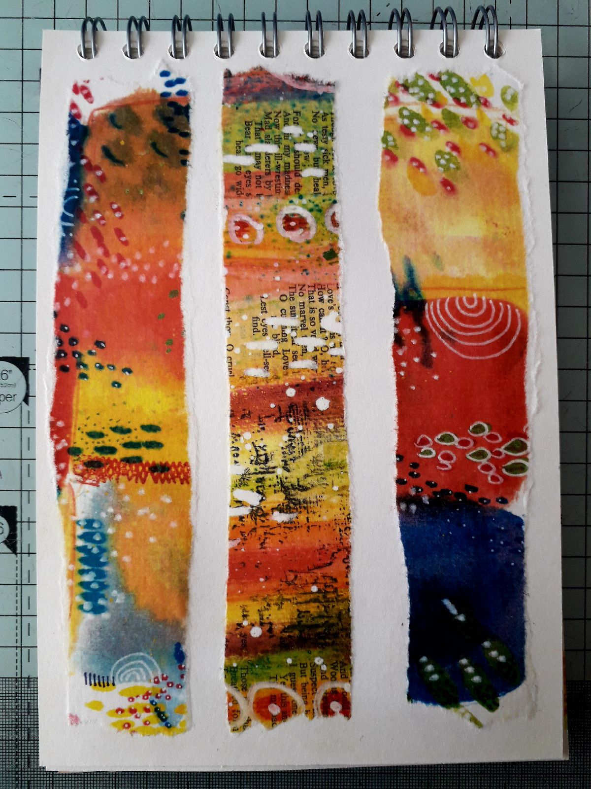 I began by using distress collage medium to glue three strips of catalyst paper to the page, leavjng a white border around each piece. I left this to dry naturally.